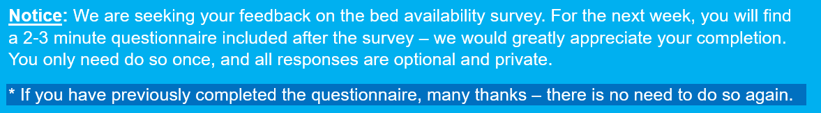 The information you provide will only be used for analysis and evaluation related to bed availability management. No personally identifiable information will be released or reported. All data will be aggregated and treated confidentially.